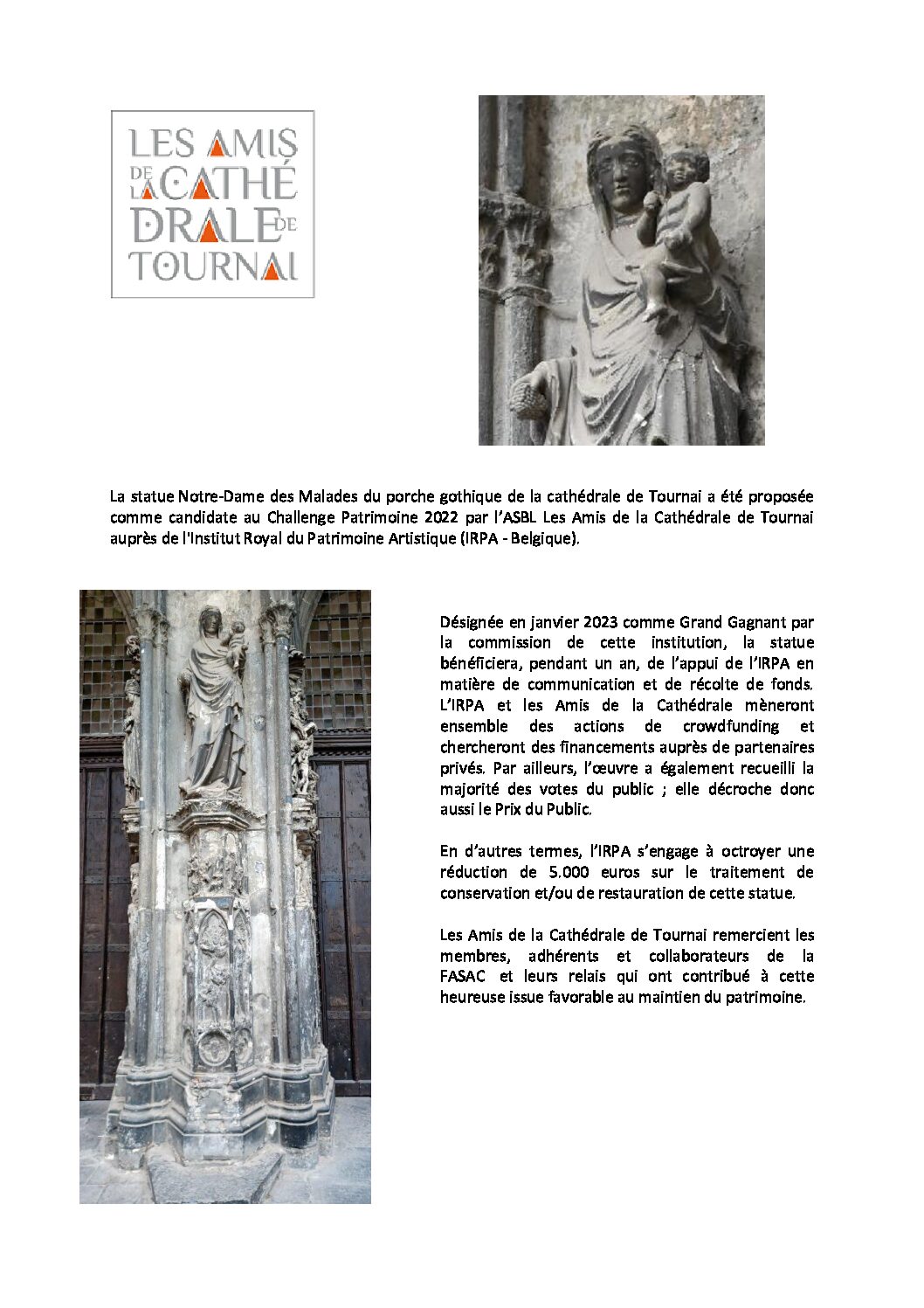 La statue Notre-Dame des Malades du porche gothique de la cathédrale de Tournai a remporté le Challenge Patrimoine 2022 soumis par les Amis de la Cathédrale de Tournai auprès de l’Institut Royal du Patrimoine Artistique (IRPA – Belgique) …